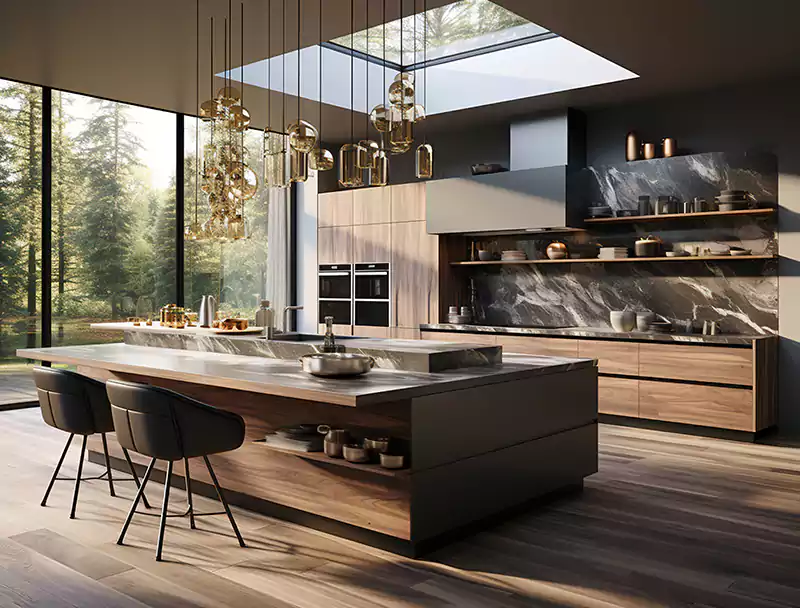 Three tiers working in harmony—ambient lighting from recessed fixtures or skylights, task lighting via under-cabinet LEDs, and accent lighting through pendants, chandeliers, or backlit stone panels.