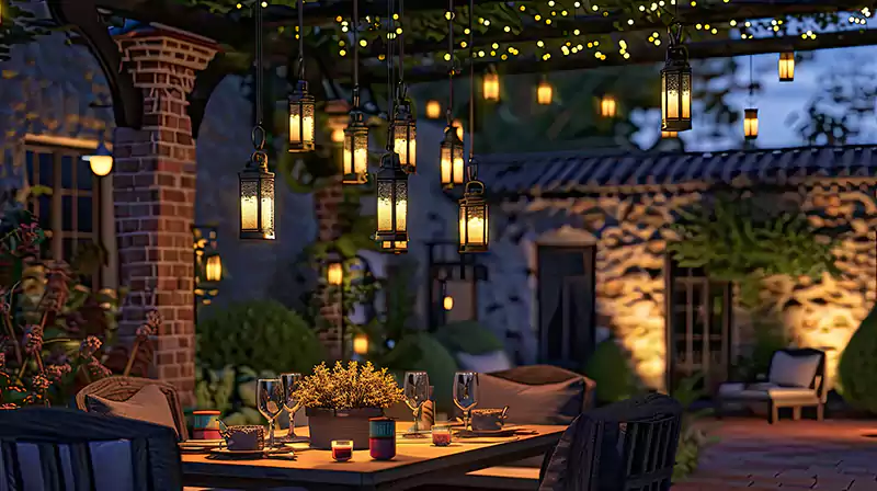 Combine string lights, lanterns, and solar-powered lamps for soft, warm lighting. Layering different light sources adds depth and creates a relaxing outdoor atmosphere.