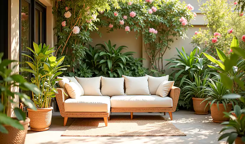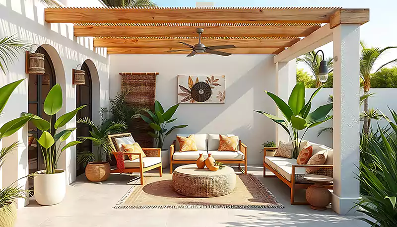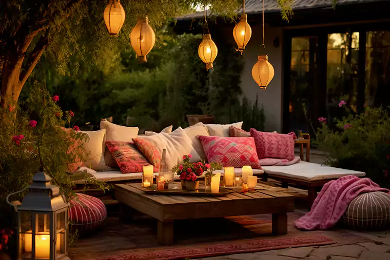 Plants add color, texture, and a natural feel. Use a mix of hanging plants, potted greenery, and vertical gardens to create a refreshing and cozy outdoor environment.